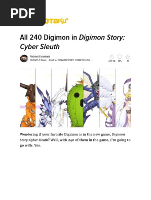 Because with digimon being digital beings their evolution chains can vary depending on what kind of data is absorbed by them. Digimon field guide this field guide contains a plethora of information on all digimon that can be found in digimon story. The patch notes are much longer than people had suspected and includes a lot of tiny changes to minimal glitches and issues in the game and also a lot of changes to move delay. Cyber sleuth manual pdf for ps4.